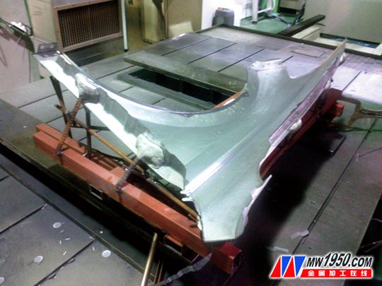 圖3 插板式支架切割車(chē)門(mén)外板 對(duì)于離線(xiàn)編程:使用編程軟件利用工件的數(shù)控模型編程(見(jiàn)圖3)。這種方式的優(yōu)點(diǎn)很多,首先,效率高,編程速度快;其次,不占用機(jī)床,可以提前編制多個(gè)程序,方便安排生產(chǎn);并且此類(lèi)程序方便更改,對(duì)稱(chēng)工件無(wú)需要重復(fù)編程。相比示教編程,不需要全尺寸的刻線(xiàn)件,只需要幾個(gè)刻線(xiàn)點(diǎn)(三個(gè)以上)即可。但這種編程方式準(zhǔn)確度低,后期改動(dòng)大。因?yàn)殡x線(xiàn)編寫(xiě)的程序在機(jī)床加工時(shí)對(duì)程序坐標(biāo)系的定位是通過(guò)實(shí)際采集刻線(xiàn)點(diǎn)的機(jī)床坐標(biāo)值與數(shù)據(jù)模型中的理論坐標(biāo)值進(jìn)行比對(duì),通過(guò)某種算法擬合程序。也就是說(shuō),它會(huì)對(duì)實(shí)際工件的偏差做出相對(duì)應(yīng)的調(diào)整,使程序的軌跡更貼近于實(shí)際工件。但是這種策略幾乎可以肯定,實(shí)際加工出來(lái)的工件會(huì)有所偏差。而數(shù)據(jù)點(diǎn)的采集一般設(shè)在較容易采集區(qū)域,只是根據(jù)這三個(gè)點(diǎn)間偏差來(lái)回移動(dòng)坐標(biāo)系,難免無(wú)法顧及全部。因此,在實(shí)際生產(chǎn)中,必須對(duì)程序進(jìn)行調(diào)整。 (2)工裝支架 工裝支架通常有兩種制作方式。一種是插板式的,即通過(guò)切割出對(duì)應(yīng)產(chǎn)品形狀的鋼板,彼此拼搭而成。這種方法速度快,效率高,是一種粗定位。另一種是用鋼筋(管)焊在底座上和產(chǎn)品搭接部分或使用舊件的一部分(手工切割下來(lái)),或使用樹(shù)脂塊和產(chǎn)品貼附。這種方法更貼近實(shí)際工件。三維激光切割主要面對(duì)的是拉延件,無(wú)法用銷(xiāo)子等孔來(lái)定位,只能靠工件的形狀來(lái)定位,而薄板件的變形量又比較大,所以生產(chǎn)中在支架上輔以磁鐵等加強(qiáng)定位,如圖4、圖5所示。
